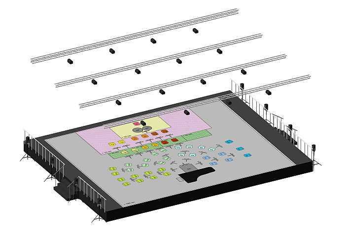 Die Mikrofonie bestand aus über 80 Schoeps Colettesystemen, welche zusammen mit 2 Yamaha Rivage Mischpulten und dazugehörigen Yamaha RPio 622 Stageboxen, keinerlei Wünsche offen ließen. Dann haben wir 16 Lautsprecher in einem quadratischen Raster über dem Orchester aufgehangen. Die erste Reihe hängt idealerweise über den Violinen, die letzte über dem Schlagwerk. Ist das Orchester größer oder kleiner, passt man die Abstände der Lautsprecher an. Dann brachten wir rechts und links jeweils 4 Lautsprecher neben dem Orchester über „Ohrhöhe“ an. Wir haben nun 24 Lautsprecher, welche wir separat ansteuern konnten. Zusammen mit einem speziellen 24 Kanal Hallgerät (TC REVERB 24) bauten wir nun einen Raum, welcher sich von den grundlegenden Parametern akustisch nicht allzu sehr vom tatsächlichen Raum unterschied, allerdings in einigen Punkten aber optimiert wurde, so dass der räumliche Eindruck stärker nach vorne trat.